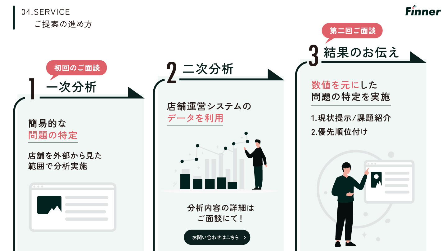 他社さんも親身に対応してくれたものの、ふわっとした話が多かったのですが、Finnerさんは事前の無料分析でデータをしっかり分析してくれて、改善点も具体的に示してくれました。